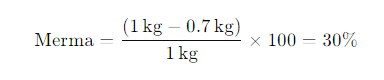 Por ejemplo, si compras una pieza de carne de 1 kg (peso bruto) y después de quitarle huesos y grasa el peso final es de 700 g (peso neto), la merma sería: