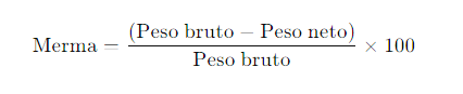 Calcular la merma de un producto es un proceso sencillo que involucra la medición de la diferencia entre el peso inicial (bruto) y el peso final (neto) del producto. Para calcularla, se utiliza la siguiente fórmula.